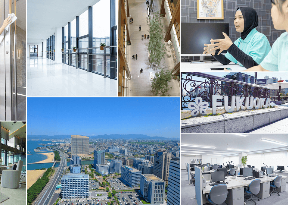 ホテル、マンション、商業ビル、各種施設様などのフロア定期清掃・設備メンテナンスをはじめ、外壁洗浄や内装工事など、九州一円対応いたします。お気軽にお見積り・お問い合わせください。